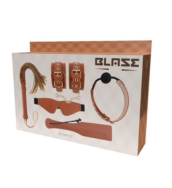 Unleash your wildest fantasies with the Blaze Elite BDSM Set Cognac, made of high-quality vegan leather. This luxurious set includes all the necessary accessories to explore the world of BDSM in style and comfort.