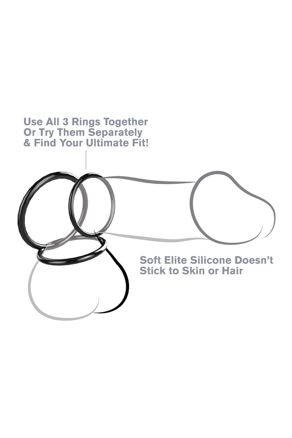 Made from our ultra-hygienic Elite Silicone™, the three performance rings range from 1.25"" (3.1 cm) to 2"" (5 cm). Find the perfect size for you and put it around the base of your shaft to gently restrict blood flow and help you achieve the biggest and most intense erections ever imagined! The ring's tight squeeze will put a clamp on performance letdowns and make a stud out of any man! Try the rings in different combinations to find the most explosive results!