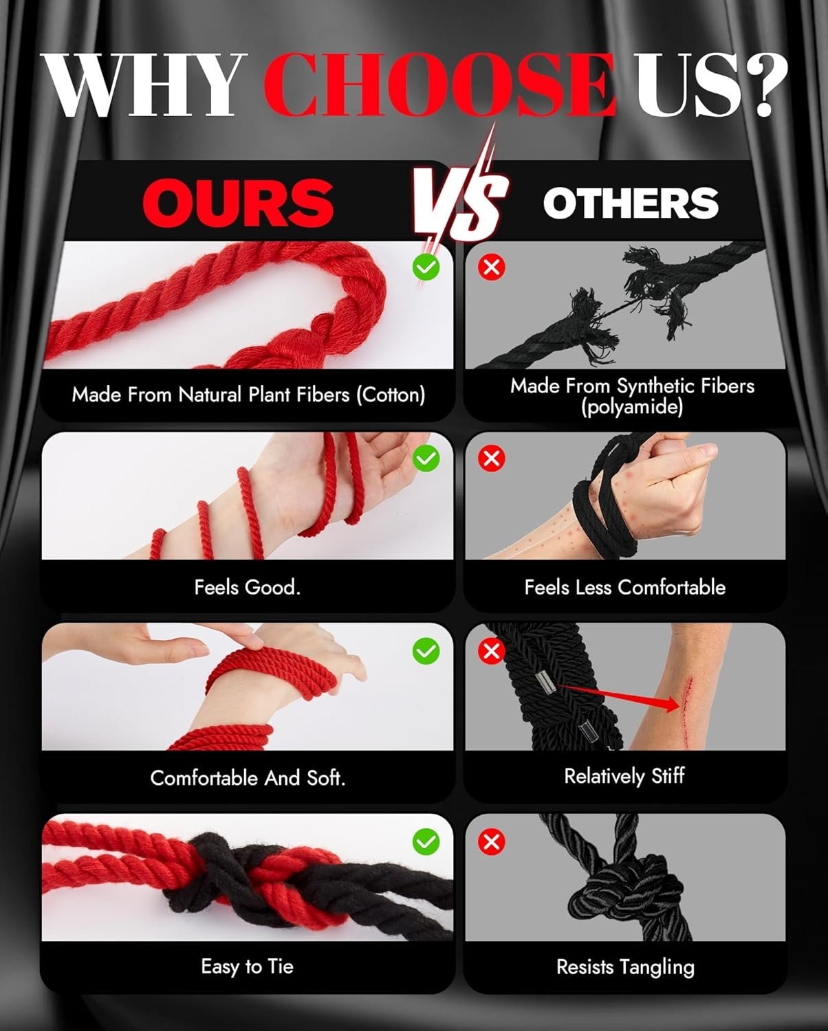 Μαλακό Βαμβακερό Σχοινί: Κατασκευασμένο από υψηλής ποιότητας βαμβάκι, τα κόκκινα σχοινιά είναι απαλά και άνετα, ιδανικά για αρχάριους αλλά και έμπειρους λάτρεις του BDSM.