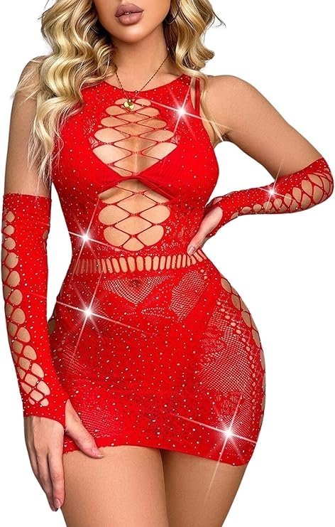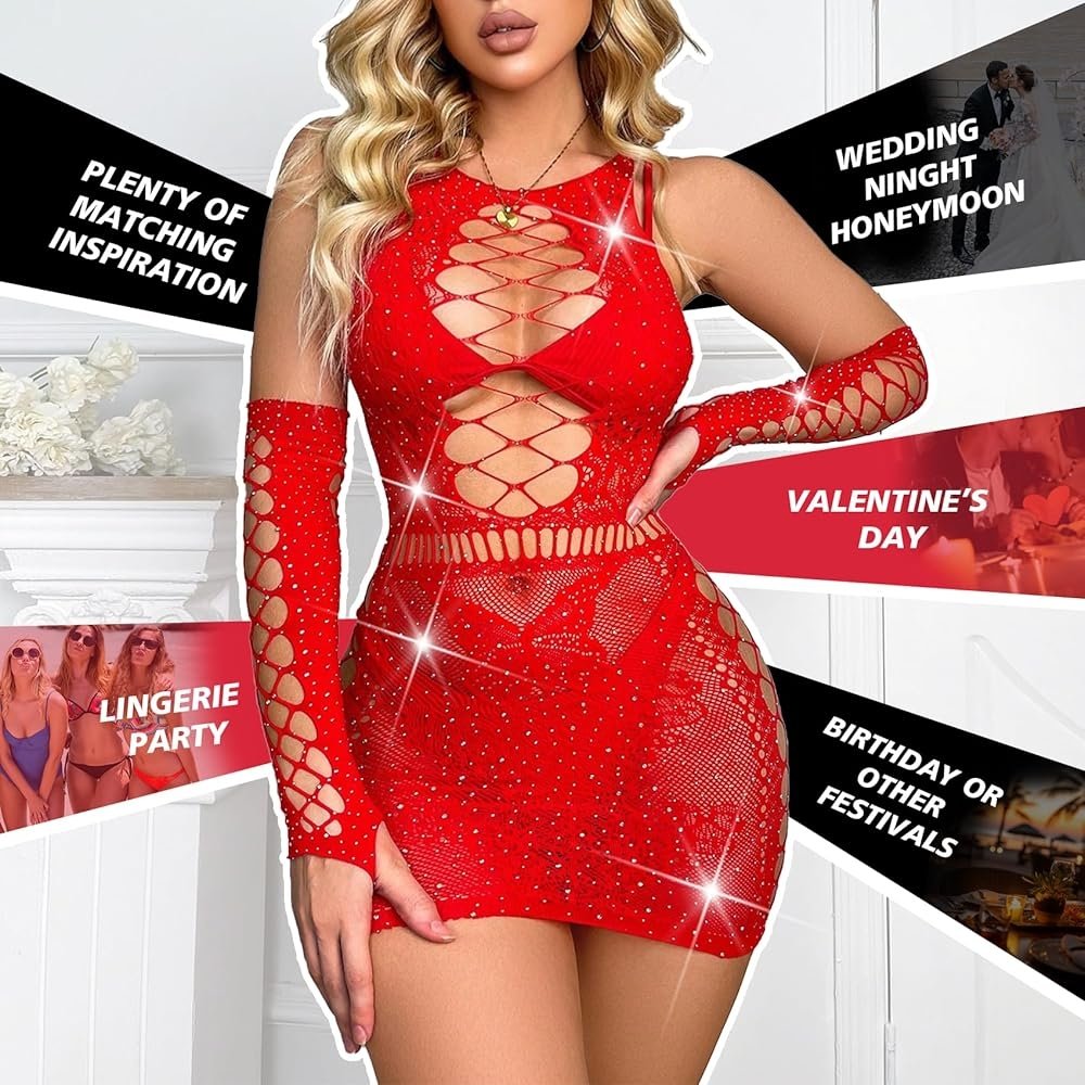 SMD Intimate Series Scarlett Crush, Sparkly Fishnet Rhinestone Bodysuit, Sexy Εφαρμοστό Διχτυωτό Φόρεμα, Κόκκινο/Red, One Size