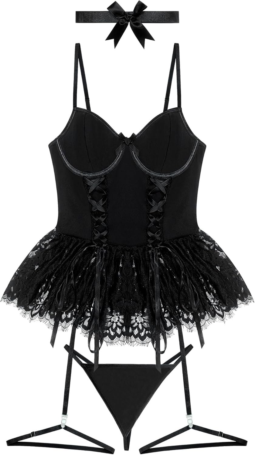 Σετ 4 τεμαχίων: bow-tie choker, underwire teddy με ζαρτιέρες, thong εσώρουχο.